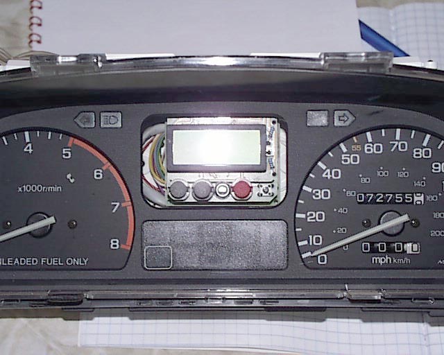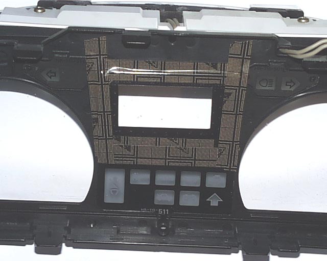 The bezel was cut out of the jacket of old 5¼ floppy disk. The texture of the jacket material closely resembles the finish of the cluster face. Once correct size had been cut, it's installed onto the display and glued from inside to the black plastic front wit PVC glue. It turn out to be accurate enough, but if I were to re-do it, I'd do it from the front. Anyway, result was as expected and display module looks like it was always there. Also, the control buttons were re-located to the dash since I was not going to drill holes in the front glass...