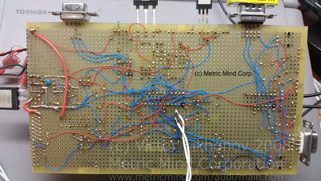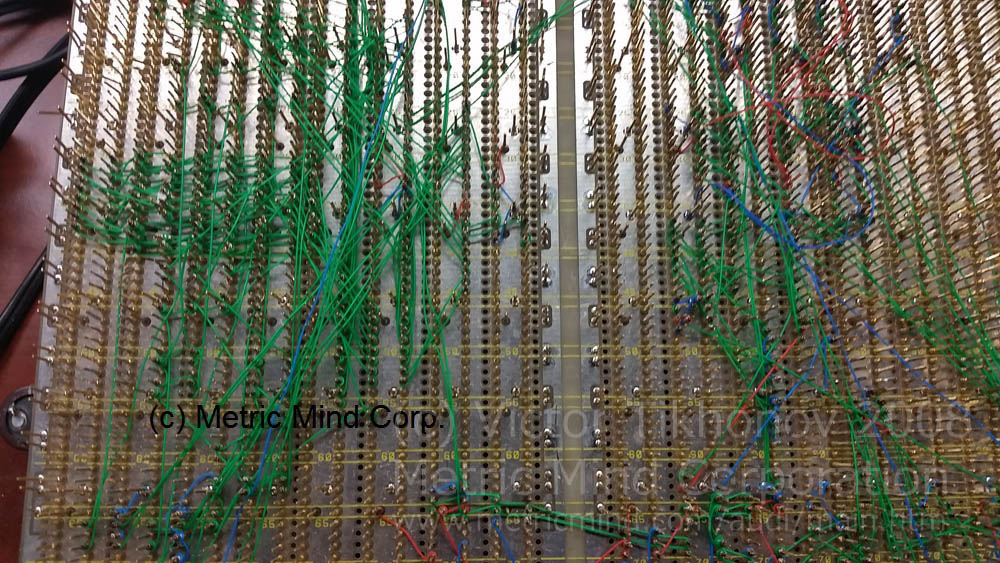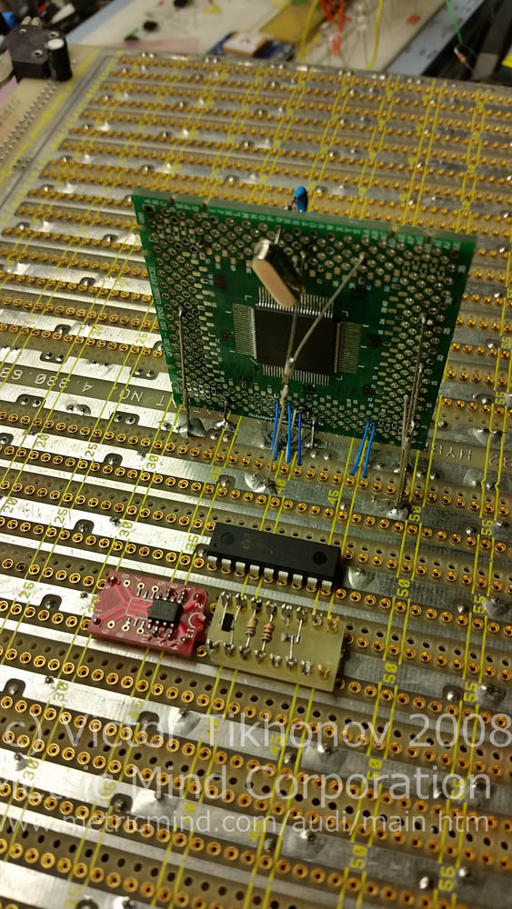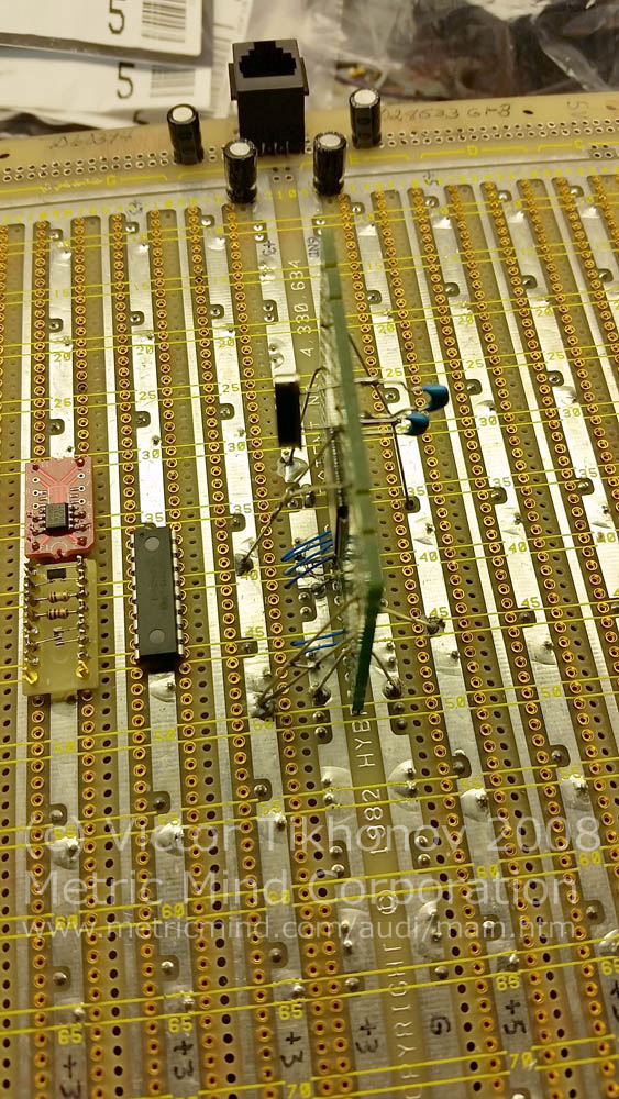 I'm always amazed when younger tinkerers stare at me when I mention wire wrapping - turns out this unfortunately becoming lost art few people remember, let alone using it. Creating circuits on wire wrapping boards is so great that it was used in the past not only for prototyping of real complex circuits but in final products. Countless main frame computers with large back plane boards with edge connectors used wire wrapped boards, which proved to be highly flexible and reliable - so much so that electronics in early satellites was assembled that way. There is still a lot info on the web about the subject of micro-welds formed between wrapping wire and square gold plated posts with sharp edges, so there is no need to repeat all this here. I just wanted to mention that in my pro engineering design work flow wire wrapping is the second and last stage of prototyping of complete systems before final circuit is settled and PCB artwork gets developed1. The choice between wire wrap boards or perforated point to point soldering boards, depends on the final circuit complexity and amount of anticipated changes. On wire wrap boards it is trivial to make changes - unwrap wrong connections. This can be done "in the field", away from quality solder stations. (Toys like cordless solder irons do not count). Here are few photos of how it all comes together. Also wire wrap boards are simpler to re-use - de-mounting al the components is not as messy as for solder boards and does not require any cleanup.