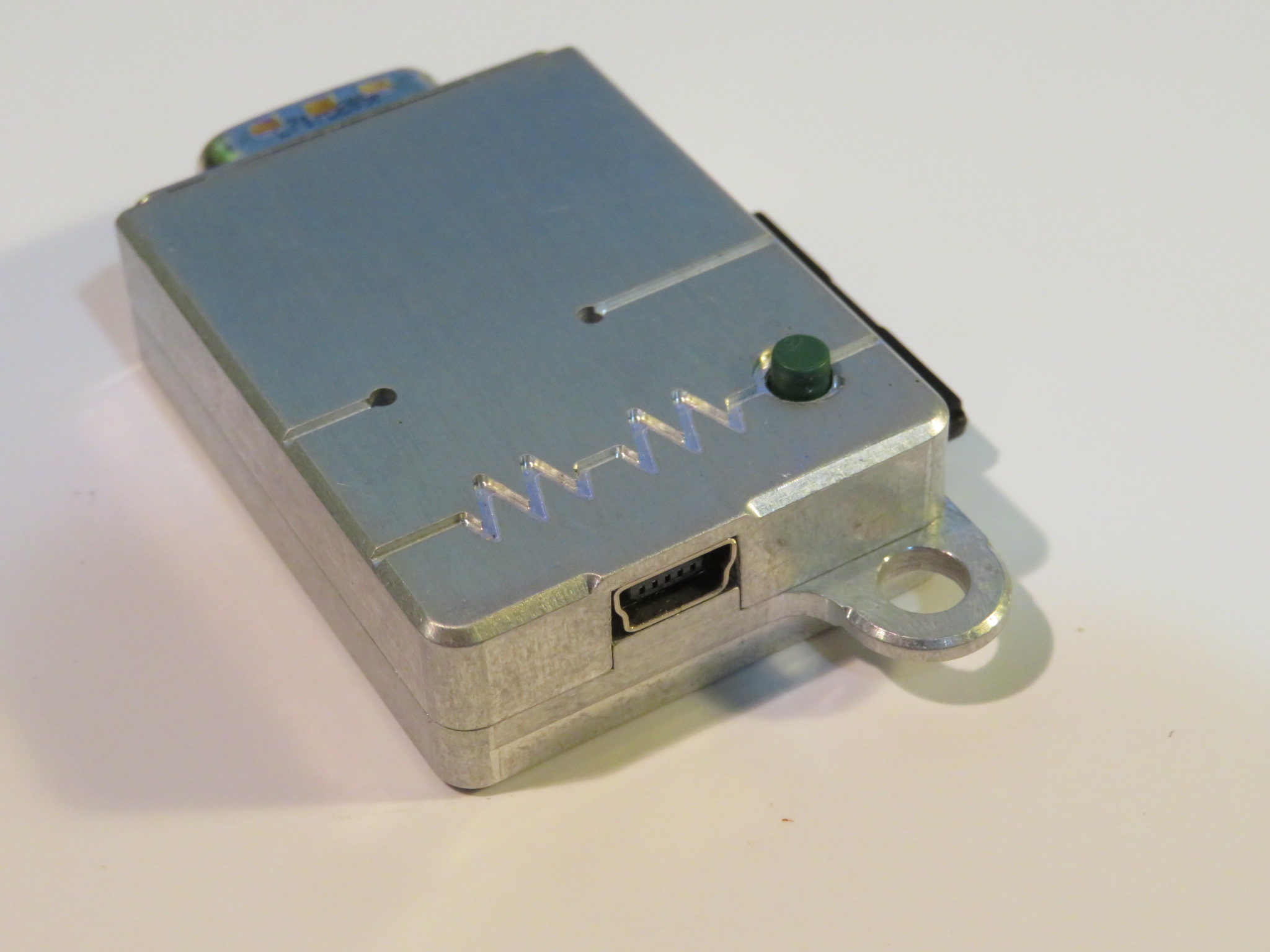 microcontroller at its core, and has only three other ICs: MAX3232 serial converter and two LDO voltage regulators. Overall dimensions of the PCB are 42mm x 30 mm (1.68" x 1.18"). The board is housed in machined aluminum case consisting in two halves. One button and two LEDs are