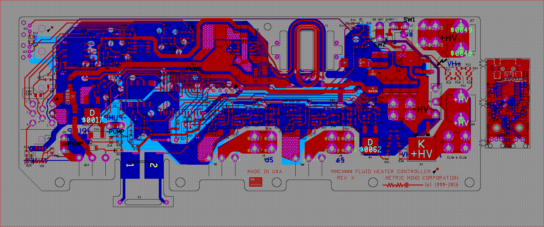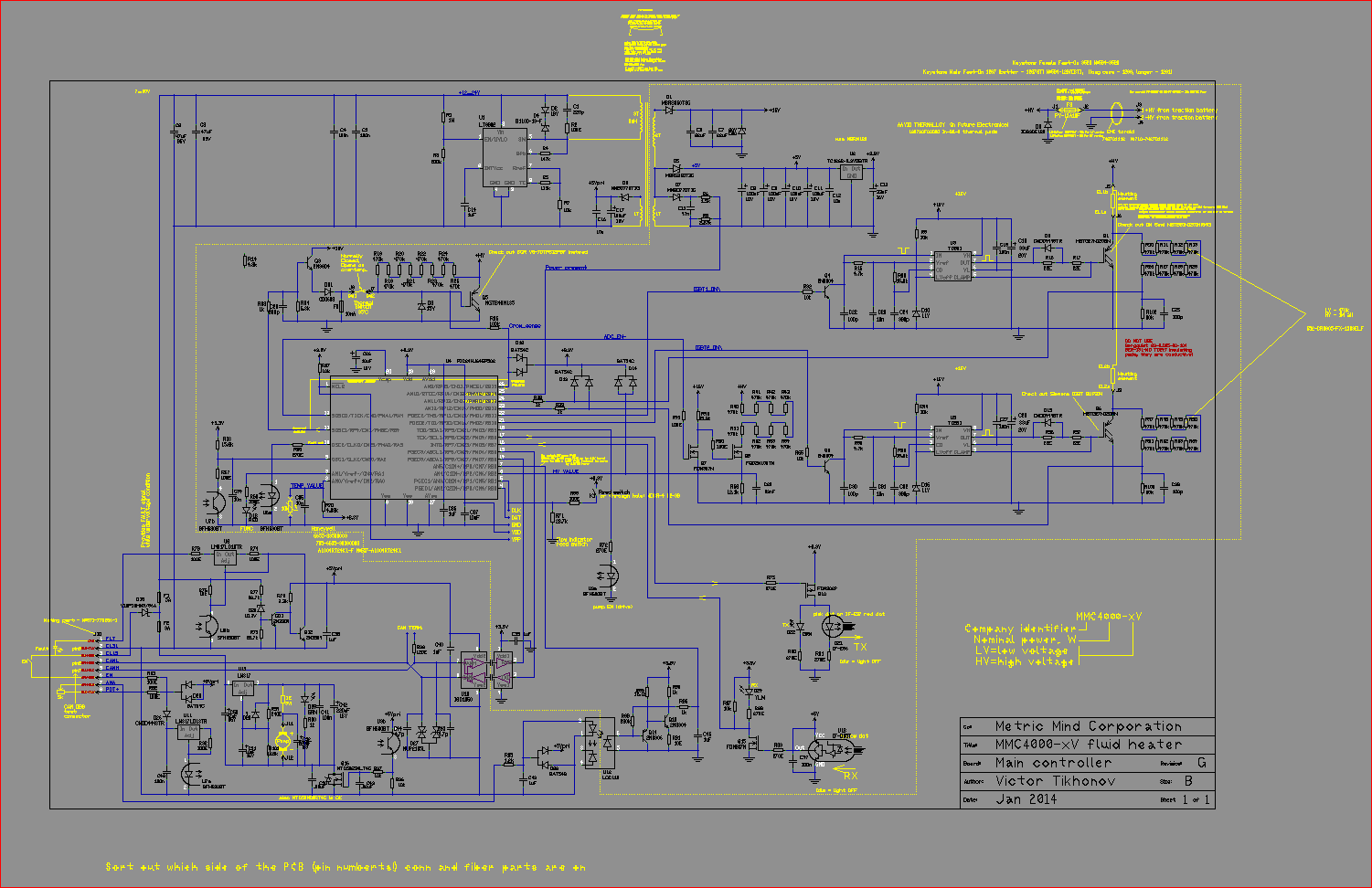 This MMC design was initially conceived as replacement of mediocre RM3 / RM4 fluid heaters whic was the product of Swiss manufacturer MED-DEA. The idea was to make not only more reliable heater, but expand its flexibility: high voltage model worked a up to 800 VDC, and it can be controlled 5 ways: O/OFF, over CAN, by PWM, by analog voltage and by external potentiometer. "4000" in the heater model represents maximum power output - 4000 W, or 4 kW. The design started circa 2013 and the prototype produced by 2015 worked well, but as with many such projects mechanical aspects of the design were the stopping point: machinned and injection-molded parts required significant initial investment that could only be paid off by secured demnand, which was never there. It could not be there because no significant marketing was done other than advertizing it on MMC website, and spending money on advertizing and marketing without realistic prospects or at least initial interest of the industry didn't make sense just like investing in mechanical parts. Classic catch 22.