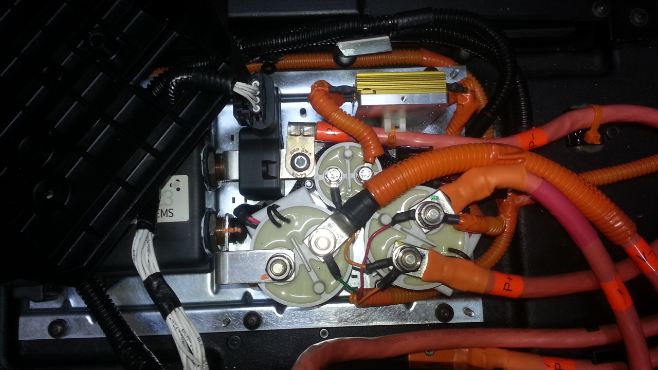 smaller precharge contactor. (There are actually two resistors in parallel, one below the